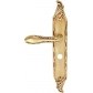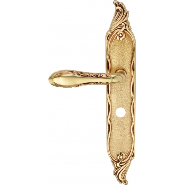 Ozdobna klamka do drzwi na długim szyldzie z blokadą WC. Odpowiednia do drzwi lewych. Wykonana z mosiądzu i dostępna w wykończeniu stare złoto (francuskie).
