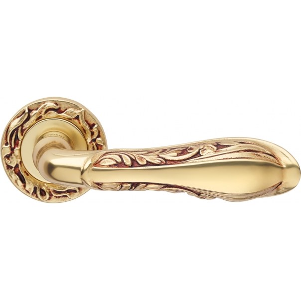 Elegancka klamka do drzwi na okrągłym szyldzie o średnicy Ø 53 mm. Wykonana z mosiądzu i dostępna w wykończeniu stare złoto (francuskie).