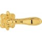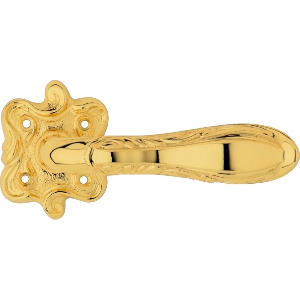 Elegancka klamka do drzwi na ozdobnym szyldzie o wymiarach 52x68 mm. Wykonana z mosiądzu i dostępna w wykończeniu pozłacanym.