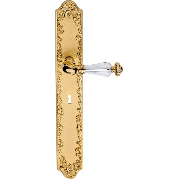 Klamka do drzwi Ninfa Crystal została wykonana z mosiądzu i jest dostępna w wykończeniu pozłacanym.