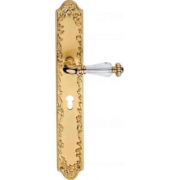 Klamka do drzwi Ninfa Crystal została wykonana z mosiądzu i jest dostępna w wykończeniu pozłacanym.