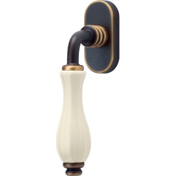 Klamka okienna Erica Porcellana Avorio jest wykonana z mosiądzu i występuje w wykończeniu brązowionym matowym (ciemnym).