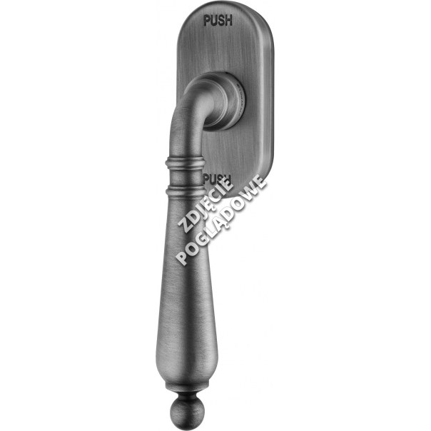Klamka okienna Florenzia posiada szyld o wymiarach 33x73 mm. Została wykonana z mosiądzu i jest dostępna w wykończeniu patynowanym stare srebro.