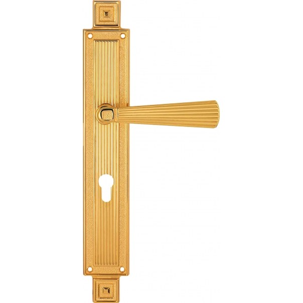 Klamka Opera na długim szyldzie z otworem na wkładkę bębenkową, dedykowana do drzwi w domach, mieszkaniach i obiektach użyteczności publicznej. Łączy w sobie elementy stylu neoklasycznego z wysokiej jakości wykończeniem i dbałością o najdrobniejsze detale. Dzięki temu przypadnie do gustu wszystkim osobom ceniącym sobie solidne wykonanie oraz eleganckie i ponadczasowe wzornictwo, w którym dominują długie, proste linie. Prezentowany model jest dostępny w wykończeniu pozłacanym.