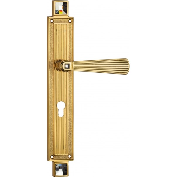 Klamka Opera Crystal Bianco na długim szyldzie z otworem na wkładkę bębenkową, dedykowana do drzwi w domach, mieszkaniach i obiektach użyteczności publicznej. Ozdobiona mieniącymi się feerią barw kryształami marki Swarovski. Łączy w sobie elementy stylu neoklasycznego z wysokiej jakości wykończeniem i dbałością o najdrobniejsze detale. Dzięki temu przypadnie do gustu wszystkim osobom ceniącym sobie solidne wykonanie oraz eleganckie i ponadczasowe wzornictwo, w którym dominują długie, proste linie. Prezentowany model jest dostępny w wykończeniu pozłacanym.