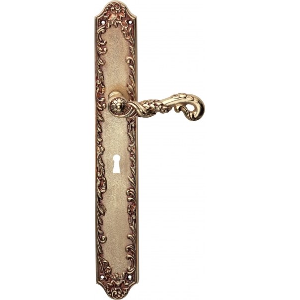 Poesia to stylowa klamka do drzwi, której charakterystyczną cechą jest bardzo bogato zdobiona rękojeść przywołująca na myśl bizantyjski przepych. W zastosowanym wzornictwie dostrzec można motywy antyczne oraz elementy świata przyrody takie jak kwiaty czy pnącza roślin. Prezentowany model klamki posiada długi szyld z otworem na klucz i występuje w wykończeniu stare złoto (francuskie).