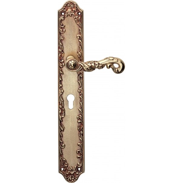 Poesia to stylowa klamka do drzwi, której charakterystyczną cechą jest bardzo bogato zdobiona rękojeść przywołująca na myśl bizantyjski przepych. W zastosowanym wzornictwie dostrzec można motywy antyczne oraz elementy świata przyrody takie jak kwiaty czy pnącza roślin. Prezentowany model klamki posiada długi szyld z otworem na wkładkę i występuje w wykończeniu stare złoto (francuskie).