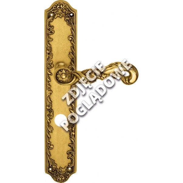 Poesia to stylowa klamka do drzwi, której charakterystyczną cechą jest bardzo bogato zdobiona rękojeść przywołująca na myśl bizantyjski przepych. W zastosowanym wzornictwie dostrzec można motywy antyczne oraz elementy świata przyrody takie jak kwiaty czy pnącza roślin. Prezentowany model klamki posiada długi szyld z blokadą WC i występuje w wykończeniu pozłacanym.
