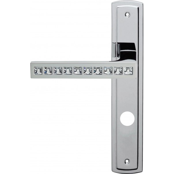 Klamka drzwiowa na długim szyldzie z otworem na blokadę WC. Zaprojektowana w minimalistycznym stylu oraz ozdobiona błyszczącymi kryształami Swarovski. Stanowi idealny, a przede wszystkim elegancki dodatek do drzwi w nowoczesnych i stylowych wnętrzach.