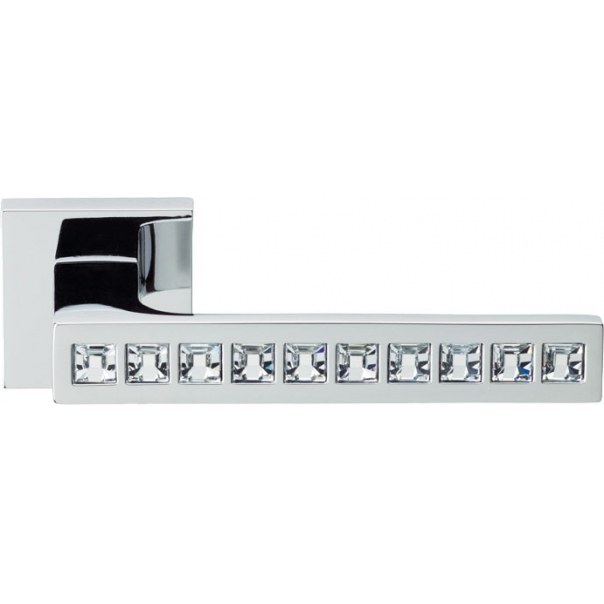 Klamka drzwiowa na kwadratowym szyldzie o wymiarach 50x50 mm. Zaprojektowana w minimalistycznym stylu oraz ozdobiona błyszczącymi kryształami Swarovski. Stanowi idealny, a przede wszystkim elegancki dodatek do drzwi w nowoczesnych i stylowych wnętrzach.
