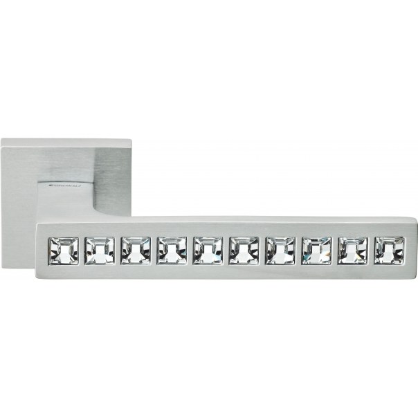 Klamka drzwiowa na kwadratowym szyldzie o wymiarach 50x50 mm. Zaprojektowana w minimalistycznym stylu oraz ozdobiona błyszczącymi kryształami Swarovski. Stanowi idealny, a przede wszystkim elegancki dodatek do drzwi w nowoczesnych i stylowych wnętrzach.