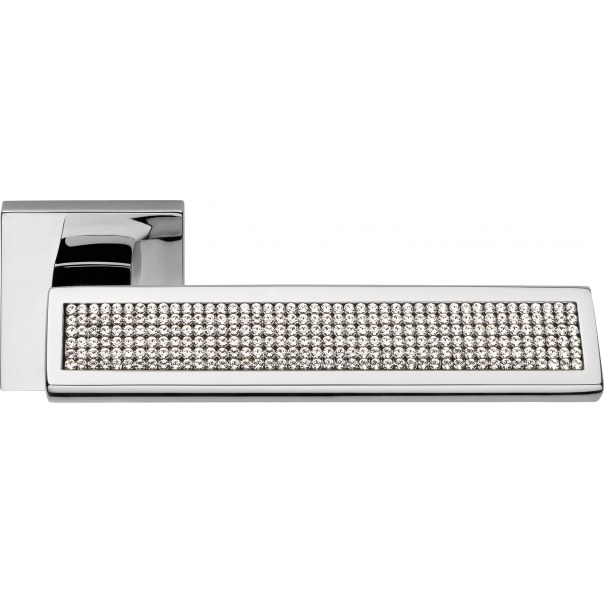 Nowoczesna, futurystyczna i bardzo wygodna klamka. Wyposażona w szeroką płaską rękojeść, ozdobioną mieniącymi się kryształami Swarovski, które zapewniają interesujący efekt stylistyczny wynikający z gry barw i odbijającego się światła. Stanowi niezwykle elegancki dodatek do wszystkich w drzwi w domach, mieszkaniach oraz w obiektach użyteczności publicznej.