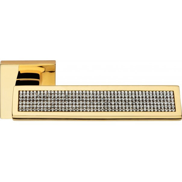 Nowoczesna, futurystyczna i bardzo wygodna klamka. Wyposażona w szeroką płaską rękojeść, ozdobioną mieniącymi się kryształami Swarovski, które zapewniają interesujący efekt stylistyczny wynikający z gry barw i odbijającego się światła. Stanowi niezwykle elegancki dodatek do wszystkich w drzwi w domach, mieszkaniach oraz w obiektach użyteczności publicznej.