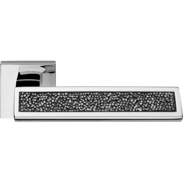 Nowoczesna, futurystyczna i bardzo wygodna klamka do drzwi. Wyposażona w szeroką płaską rękojeść, ozdobioną mieniącymi się kryształami Swarovski, które zapewniają interesujący efekt stylistyczny wynikający z gry barw i odbijającego się światła. Stanowi niezwykle elegancki dodatek do wszystkich drzwi w domach, mieszkaniach oraz w obiektach użyteczności publicznej.