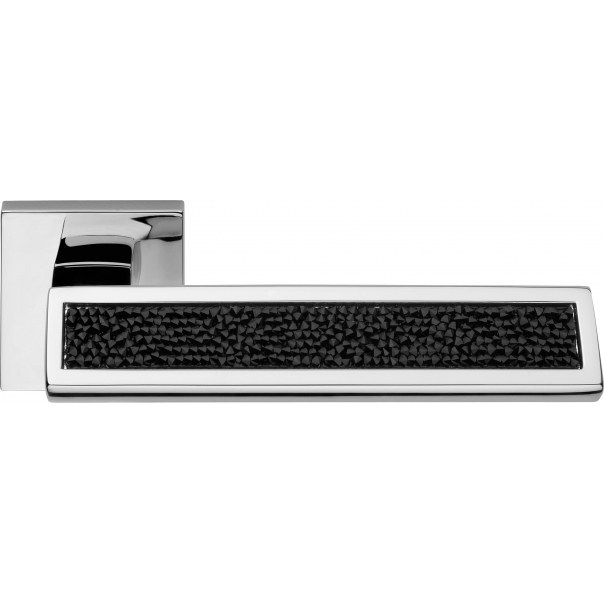 Nowoczesna, futurystyczna i bardzo wygodna klamka. Wyposażona w szeroką płaską rękojeść, ozdobioną mieniącymi się kryształami Swarovski, które zapewniają interesujący efekt stylistyczny wynikający z gry barw i odbijającego się światła. Stanowi niezwykle elegancki dodatek do wszystkich w drzwi w domach, mieszkaniach oraz w obiektach użyteczności publicznej.