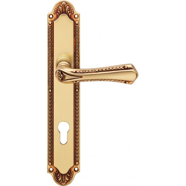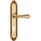 Klamka do drzwi Sissi posiada długi szyld z otworem na wkładkę. Została wykonana z mosiądzu i jest dostępna w wykończeniu stare złoto (francuskie).
