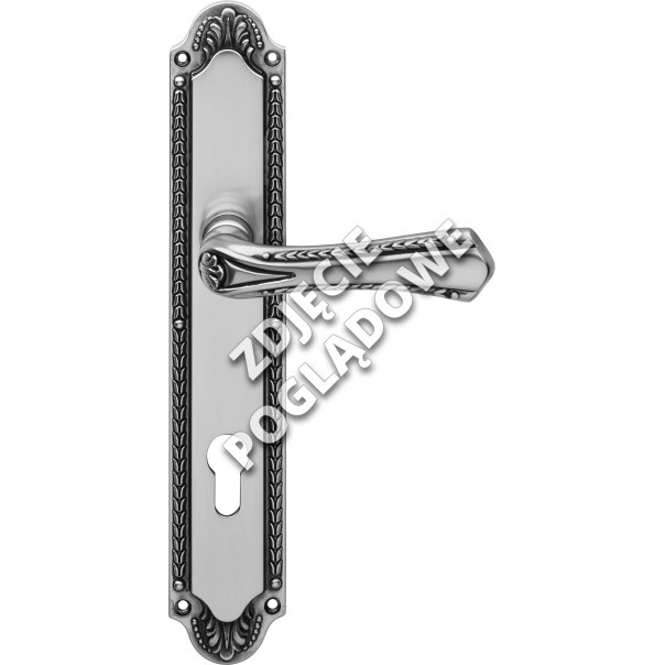 Klamka do drzwi Sissi posiada długi szyld z otworem na wkładkę. Została wykonana z mosiądzu i jest dostępna w wykończeniu stare srebro (jasne).