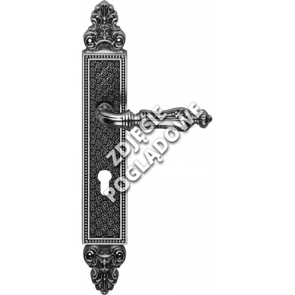 Prezentowany model posiada długi szyld z otworem na wkładkę bębenkową i występuje w wykończeniu stare srebro + czerwień.