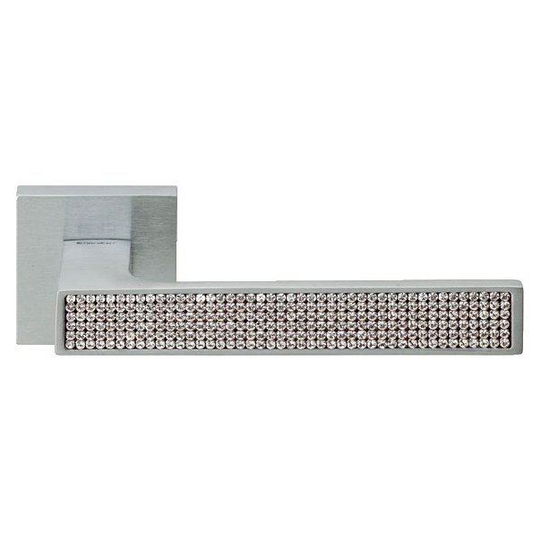 Mosiężna klamka do drzwi na kwadratowym szyldzie o wymiarach 50x50 mm. Charakteryzuje się wysoką jakością wykonania oraz posiada atrakcyjne wykończenie. Jest odpowiednia zarówno do drzwi prawych, jak i lewych. Jej rękojeść jest ozdobiona wieloma kryształami Swarovski, mieniącymi się feerią barw.