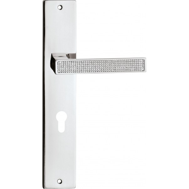 Elegancka klamka dekoracyjna na długim szyldzie Open z otworem na wkładkę bębenkową. Zen Mesh to jeden z najciekawszych i najnowszych modeli marki Linea Cali z kolekcji Design. Minimalistyczna stylistyka klamki sprawia, że stanowi ona doskonały dodatek do wszystkich nowoczesnych wnętrz oraz designerskich modeli drzwi. Jej piękno podkreślają liczne drobne kryształy Swarovski, ozdabiające rękojeść i mieniące się feerią barw. Prezentowany wariant klamki występuje w wykończeniu chromowanym.