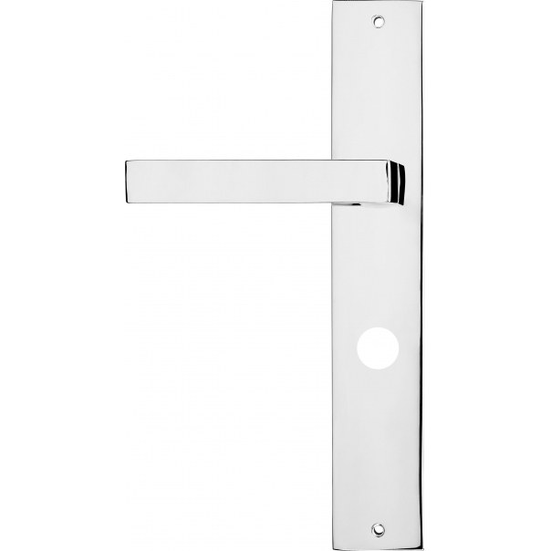 Mosiężna klamka drzwiowa na długim szyldzie Open o wymiarach 52x300 mm z otworem na blokadę WC.