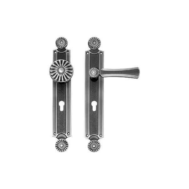 Mosiężna klamko-gałka stała na długim szyldzie z otworem na wkładkę bębenkową. Zarówno jej wzornictwo, forma, jak i kształt nawiązują do słynnego i popularnego w latach dwudziestych i trzydziestych ubiegłego wieku stylu Art Déco.