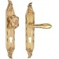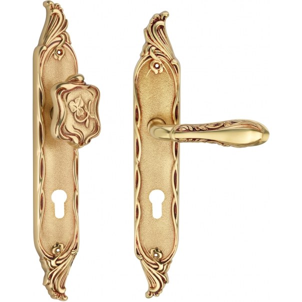 Klamko-gałka stała na długim szyldzie z otworem na wkładkę bębenkową. Wykonana z mosiądzu i dostępna w wykończeniu stare złoto (francuskie).