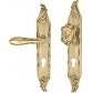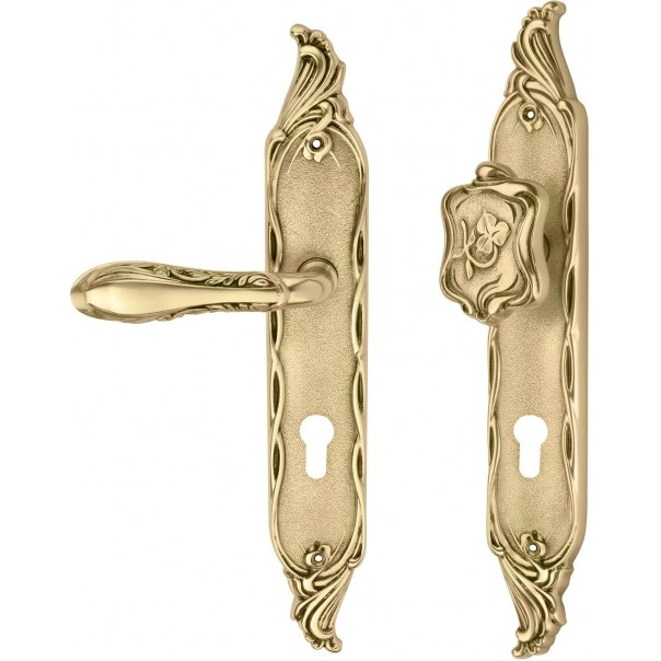 Klamko-gałka stała na długim szyldzie z otworem na wkładkę bębenkową. Wykonana z mosiądzu i dostępna w wykończeniu brązowionym matowym (jasnym).