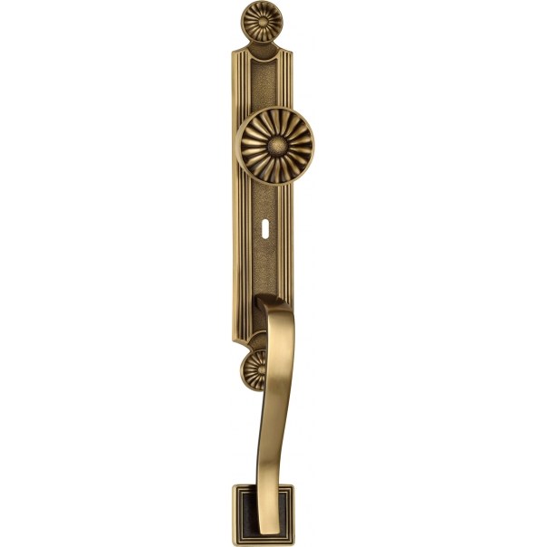 Mosiężna klamka dekoracyjna z uchwytem drzwiowym na długim szyldzie z otworem na klucz. Zarówno jej wzornictwo, forma jak i kształt nawiązują do słynnego i popularnego w latach dwudziestych i trzydziestych ubiegłego wieku stylu Art Déco.