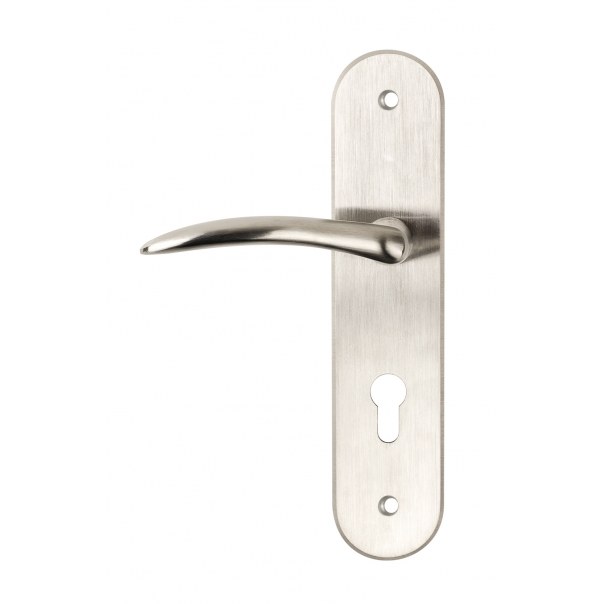 - Klamka na długim szyldzie o wymiarach 54x246 mm z otworem na wkładkę bębenkową.
