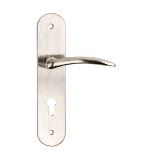 - Klamka na długim szyldzie o wymiarach 54x246 mm z otworem na wkładkę bębenkową.
