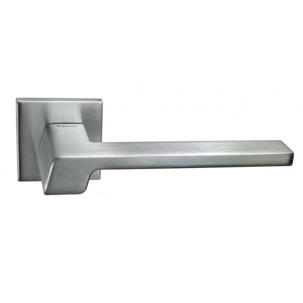 Klamka do drzwi Stream jest wykonana ze znalu. Posiada kwadratowy szyld o wymiarach 50x50 mm i występuje w wykończeniu chromowanym matowym.