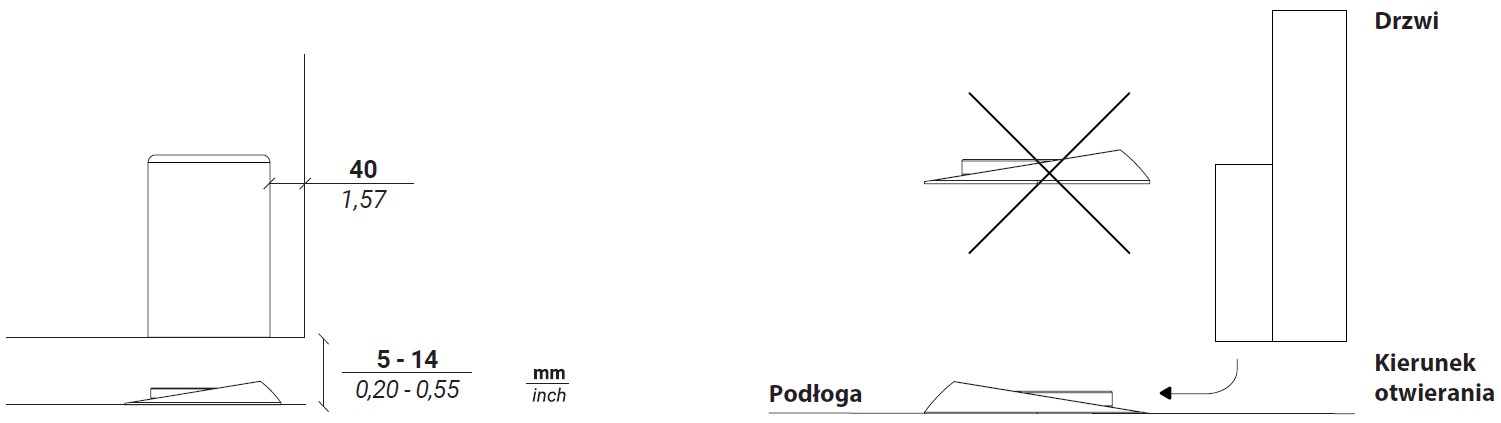 Wymiar szczeliny pomiędzy skrzydłem, a podłogą musi mieścić się w przedziale od 5 do 14 mm.