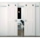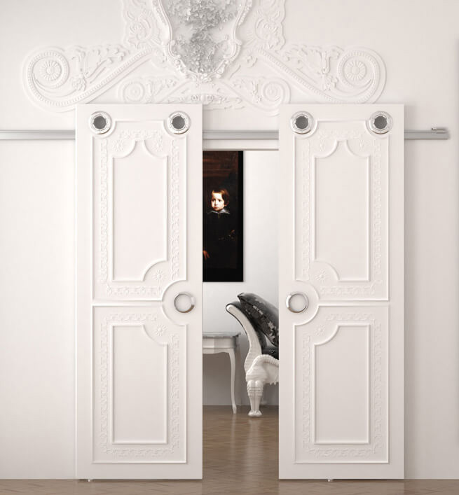 System przesuwny z widocznym mechanizmem dedykowany do zastosowania w drzwiach drewnianych.