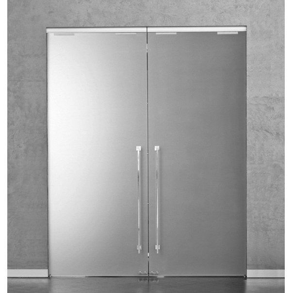 System przesuwny dedykowany do drzwi dwuskrzydłowych całoszklanych o grubości tafli 8/10/12 mm i maksymalnej wadze skrzydła 80/120 kg. System działa symultanicznie co oznacza, że oba skrzydła drzwiowe są otwierane jednocześnie.