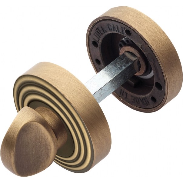 Okrągła blokada WC o średnicy Ø 54 mm. Montowana na śruby i wkręty. Wykonana z mosiądzu i dostępna w wykończeniu brązowionym matowym (ciemnym).