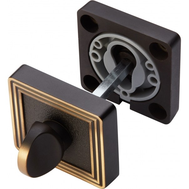 Blokada WC na szyldzie kwadratowym o wymiarach 60x60 mm. Montowana na śruby i wkręty. Wykonana z mosiądzu i dostępna w wykończeniu brązowionym matowym (ciemnym).
