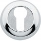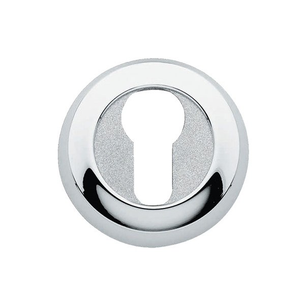 Dolny szyld okrągły o średnicy Ø 54 mm, wyposażony w otwór na wkładkę bębenkową. Montowany na śruby i wkręty. Wykonany z mosiądzu i dostępny w wykończeniu chromowanym i chromowanym piaskowanym.