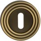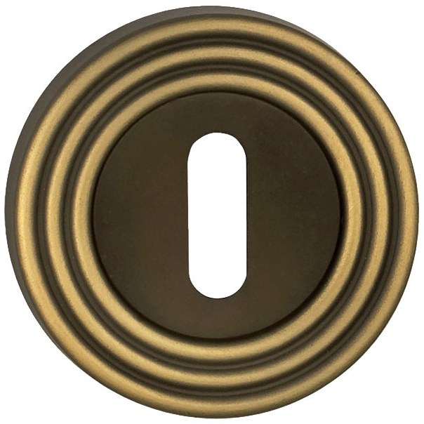 Dolny szyld okrągły o średnicy Ø 54 mm, wyposażony w otwór na klucz. Montowany na śruby i wkręty. Wykonany z mosiądzu i dostępny w wykończeniu brązowionym matowym (ciemnym).