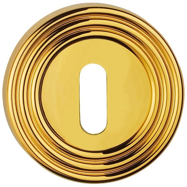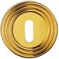 Dolny szyld okrągły o średnicy Ø 54 mm, wyposażony w otwór na klucz. Montowany na śruby i wkręty. Wykonany z mosiądzu i dostępny w wykończeniu pozłacanym.