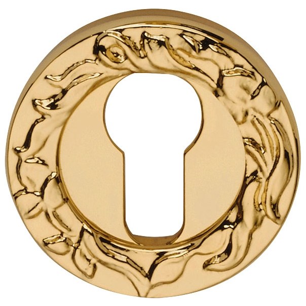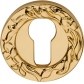 Ozdobny szyld okrągły o średnicy Ø 53 mm, wyposażony w otwór na wkładkę bębenkową. Montowany na śruby i wkręty. Wykonany z mosiądzu i dostępny w wykończeniu pozłacanym.