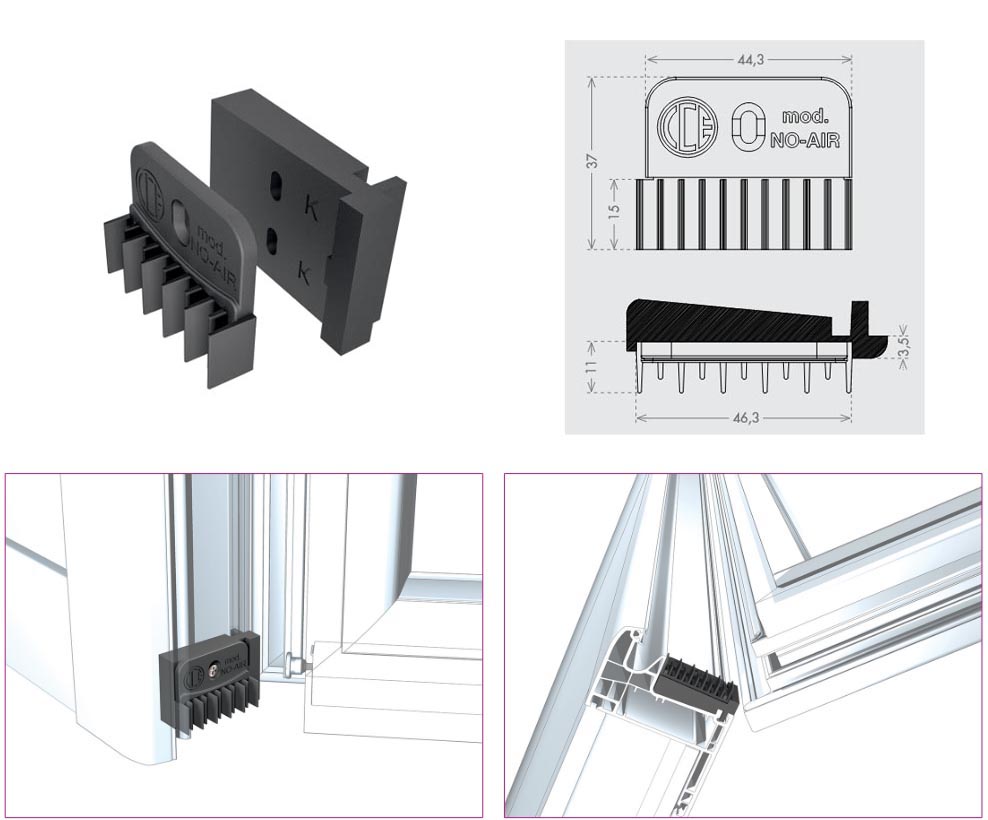 Dwie uszczelki dociskowe o grubości 11 mm. Dedykowane do drzwi profilowych (PCV), kompatybilne z większością dostępnych profili PCV. Dostarczane wraz z dedykowanymi wkrętami. Dostępne w wykończeniu w kolorze czarnym. Ich wymiary wynoszą 44,3x37 mm. Prawidłowo zamontowane uszczelki No Air PVC zapewniają wzrost izolacyjności akustycznej o dodatkowe 3 dB.