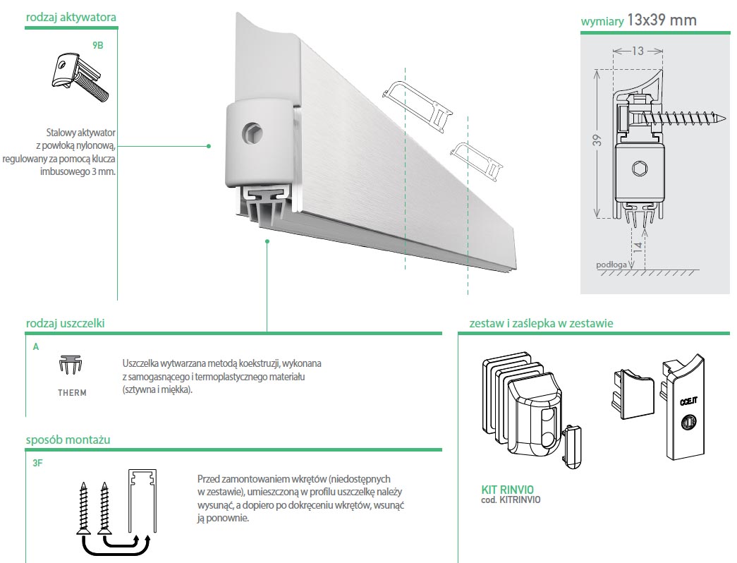Uszczelka opadająca o długości 430 mm z możliwością skrócenia maksymalnie o 120 mm. Umieszczona w aluminiowym profilu o wymiarach 13x39 mm w wykończeniu w anodyzowanym srebrnym. Jest montowana nawierzchniowo na skrzydle drzwiowym. Uszczelka chroni przed przedostawaniem się kurzu, pyłu oraz innych drobnych zanieczyszczeń do wnętrza budynku / pomieszczenia. Ogranicza również ryzyko powstawania przeciągów i przenikania dźwięków do budynku lub pomieszczenia.