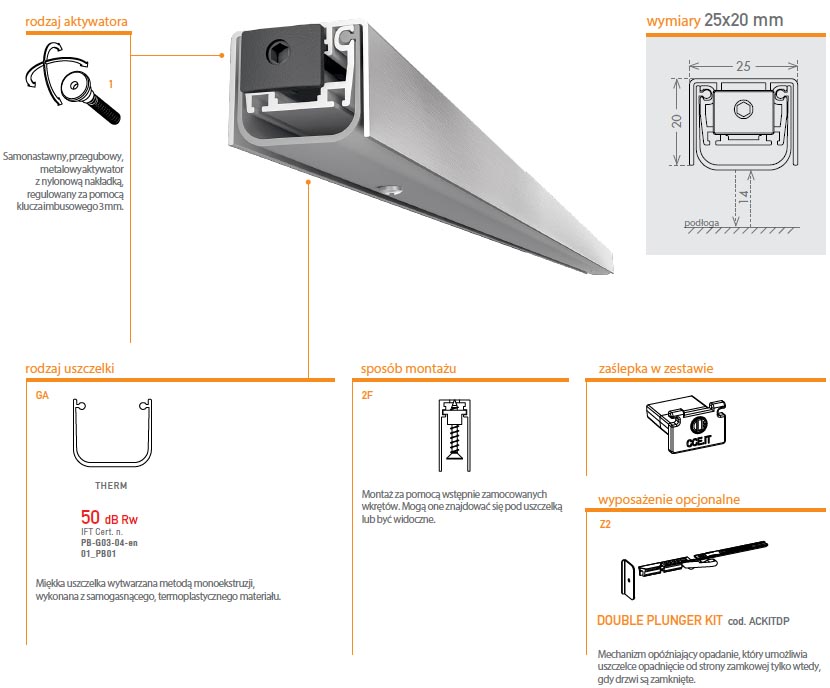 Uszczelka opadająca o długości 1030 mm z możliwością skrócenia maksymalnie o 150 mm. Umieszczona w aluminiowym profilu o wymiarach 25x20 mm w wykończeniu anodyzowanym srebrnym. Jest montowana na wkręty od dołu skrzydła. Uszczelka chroni przed przedostawaniem się kurzu, pyłu oraz innych drobnych zanieczyszczeń do wnętrza budynku / pomieszczenia, a także zapewnia izolację akustyczną do 50 dB.
