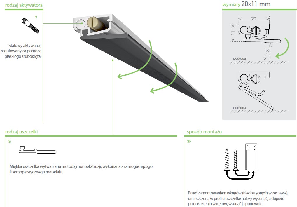 Uszczelka opadająca o długości 1030 mm z możliwością skrócenia maksymalnie o 200 mm. Umieszczona w aluminiowym profilu o wymiarach 20x11 mm w wykończeniu anodyzowanym srebrnym. Jest montowana na wkręty od dołu skrzydła. Uszczelka chroni przed przedostawaniem się kurzu, pyłu oraz innych drobnych zanieczyszczeń do wnętrza budynku / pomieszczenia, a także ogranicza ryzyko powstawania przeciągów.