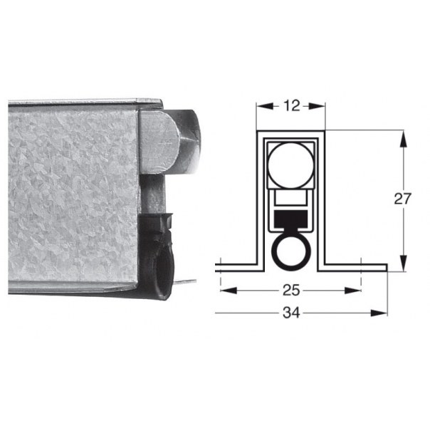 Uszczelka opadająca o długości 725 mm. Wykonana z samogasnącego materiału i umieszczona w aluminiowym profilu o wymiarach 34x27 mm.