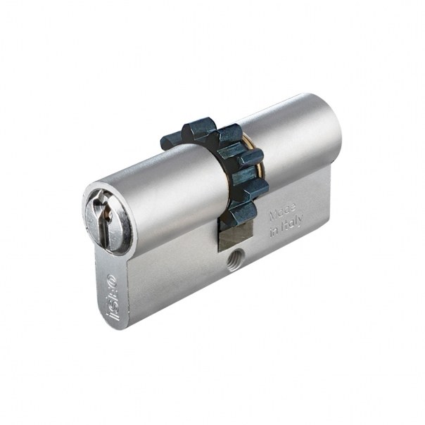 Wkładka bębenkowa z zębatką wyposażona w pięć mosiężnych kołków o zwiększonej odporności na manipulacyjne otwarcie oraz zębatkę. Odpowiednia do zastosowania w systemach klucza. Wykonana z mosiądzu i dostępna w wykończeniu niklowanym matowym. Dostarczana bez kluczy.