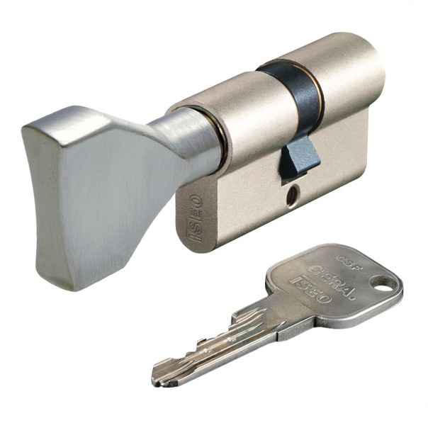 Dwustronna wkładka bębenkowa z gałką dostarczana w komplecie wraz z trzema kluczami o zastrzeżonym i chronionym profilu. Jest wykonana z mosiądzu i posiada wykończenie niklowane matowe.