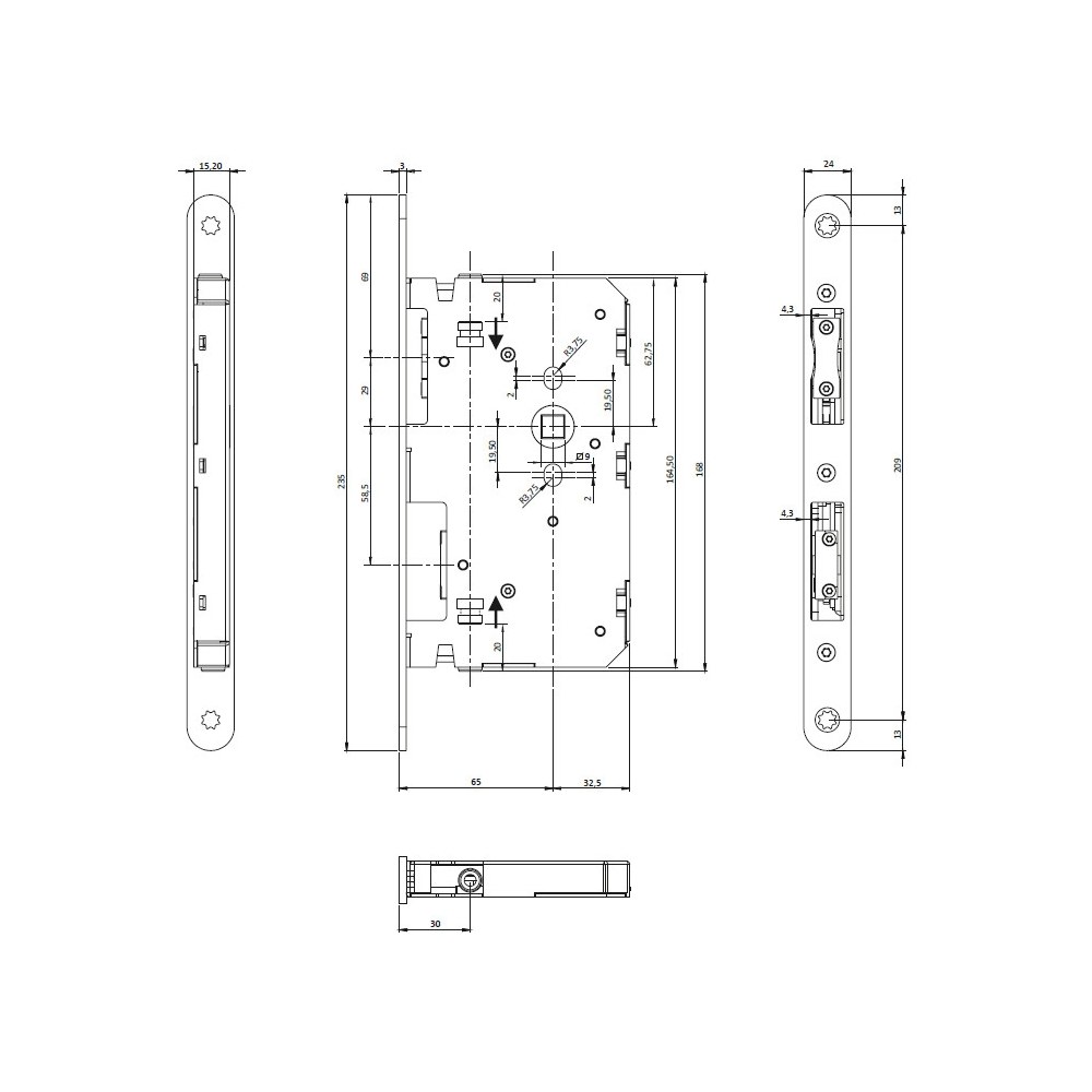 Przeciwzamek z funkcją paniczną posiada rozstaw 72 mm i głębokość (dormas) 65 mm. Jest wyposażony w wykonaną z ocynkowanej stali blachę czołową o wymiarach 24x3 mm, dostępną w wykończeniu galwanizowanym na biało. Jeśli pojawi się taka potrzeba, blachę czołową można odkręcić, na przykład w celach związanych z konserwacją lub aby ją wymienić na model o tych samych wymiarach, ale w innym wykończeniu.