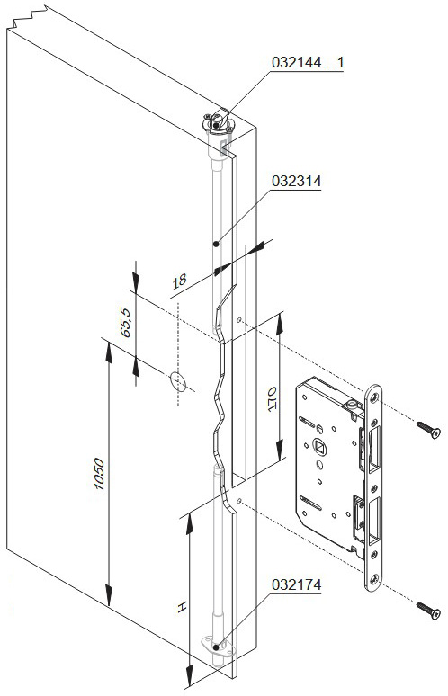 Zamieszczony obok rysunek techniczny przedstawia prawidłowy sposób montażu przeciwzamka i dedykowanych do niego akcesoriów w skrzydle drzwiowym.